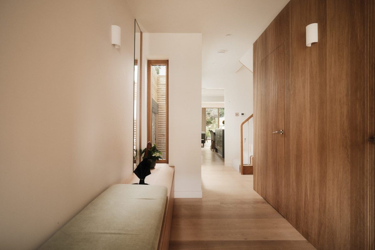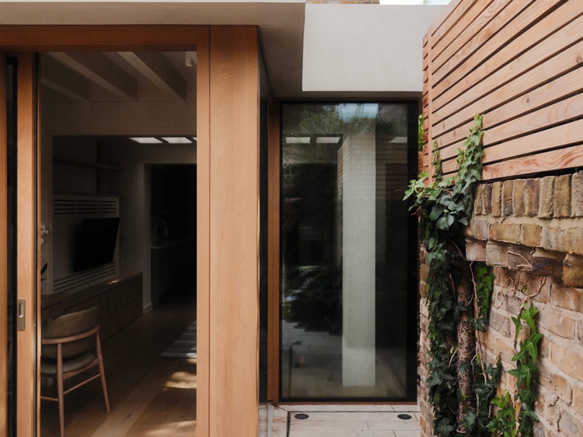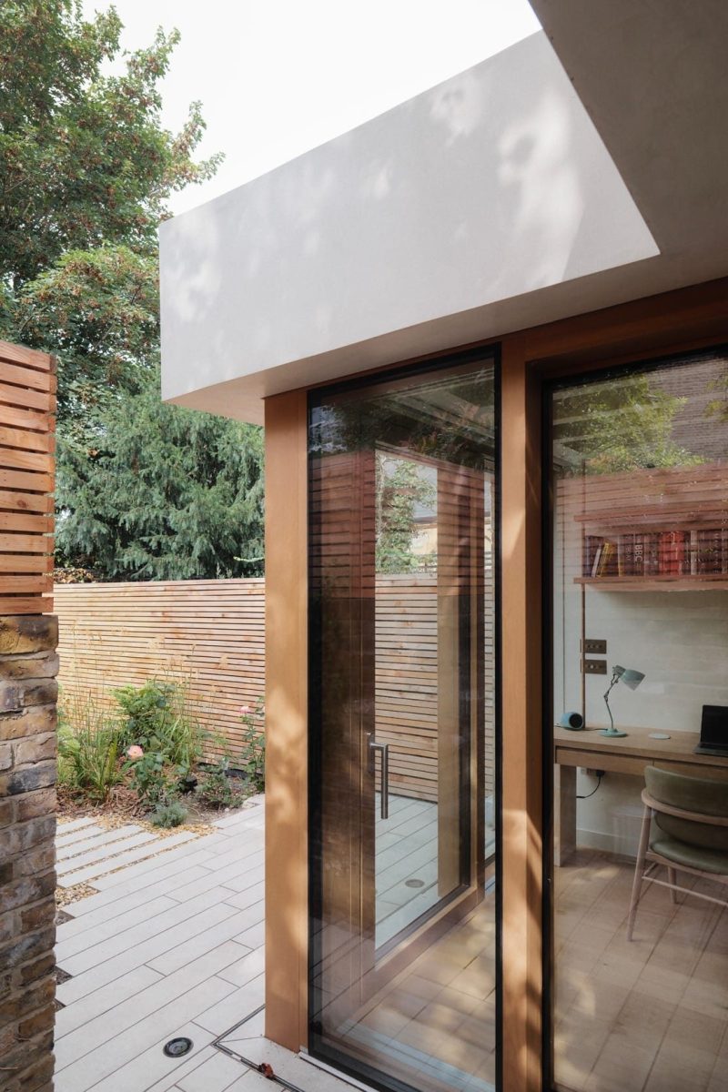 At the garden corner, sliding doors open in two directions — one leading to the rear garden, the other to a quiet courtyard beside the desk — allowing the writer to work surrounded by views and natural light. A fire-rated oak window and Vantage Flush entrance door, both carefully integrated into the brickwork, complete the scheme.