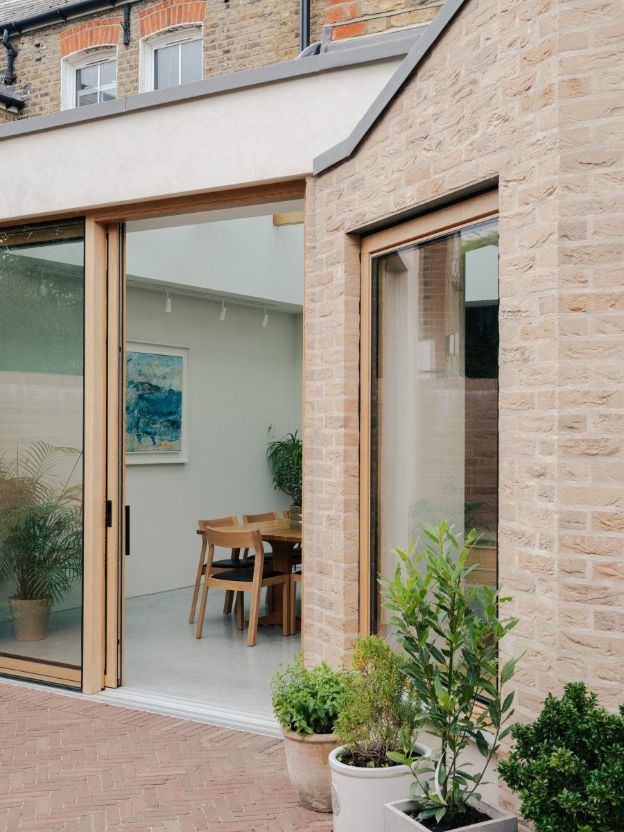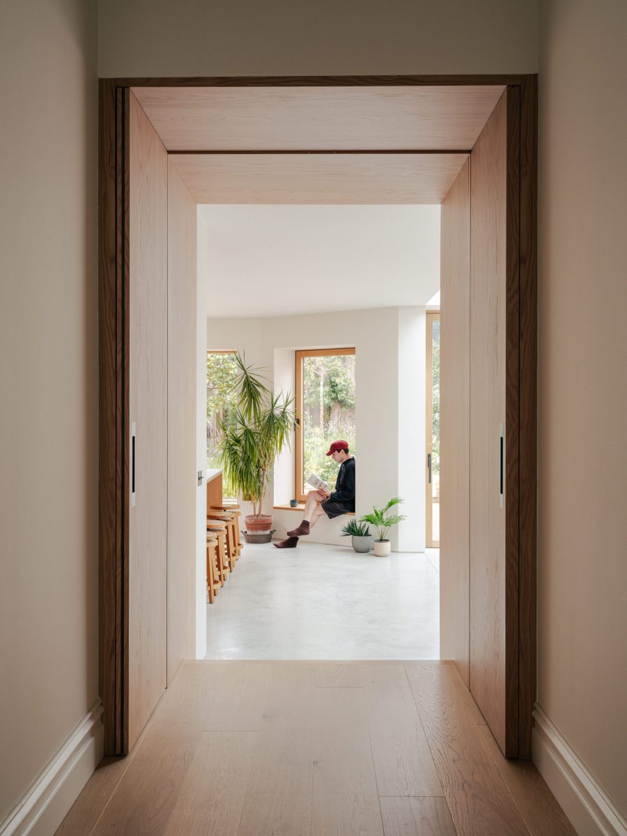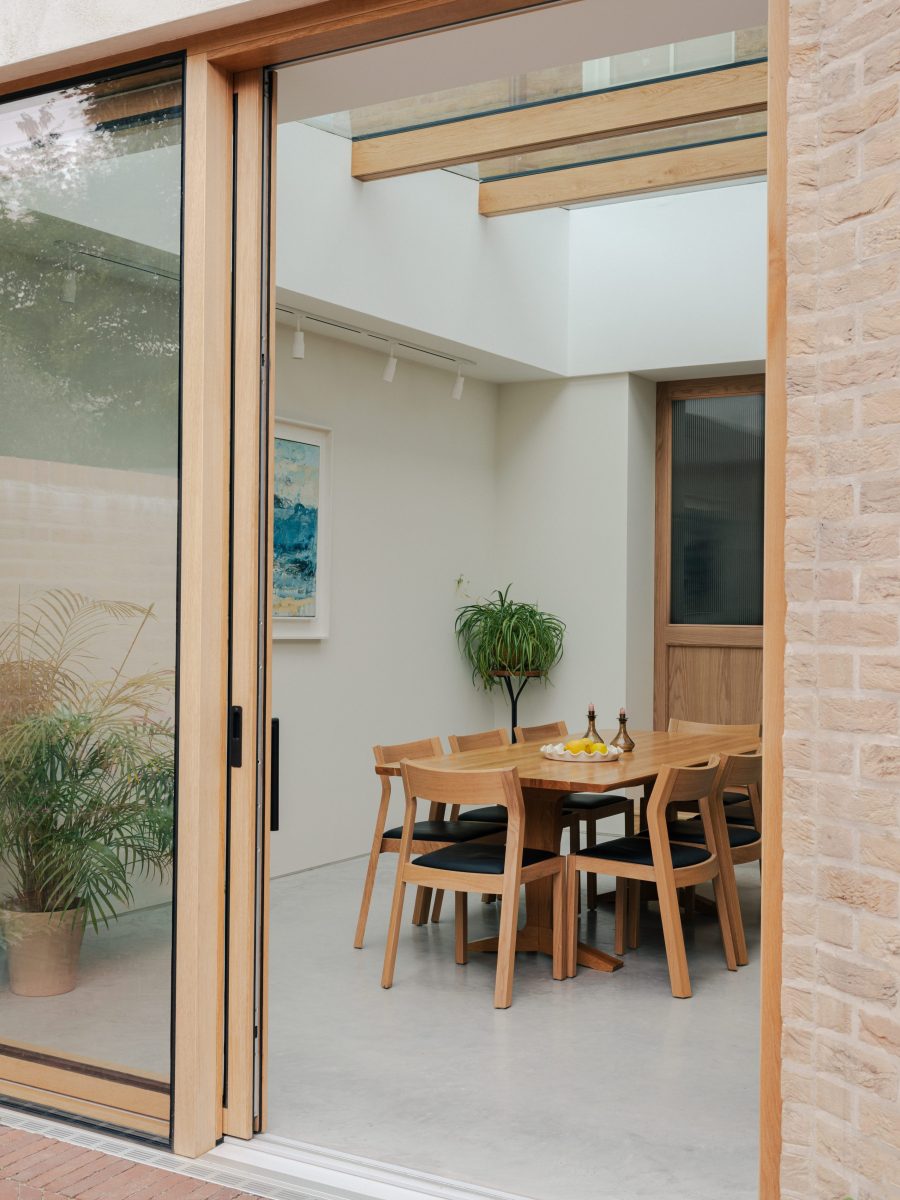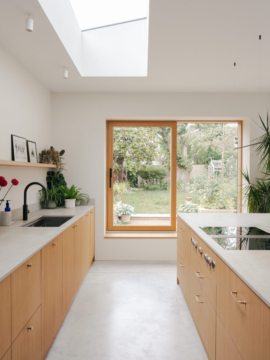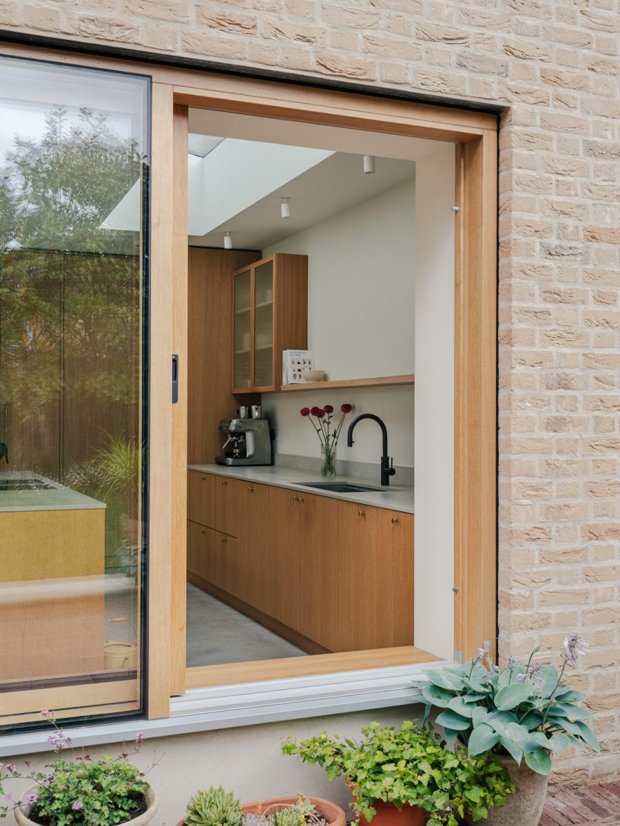 In the kitchen, a sliding window doubles as a casual serving hatch and garden connection, while the detailing of the oak reveals and low thresholds adds a sense of quiet precision.