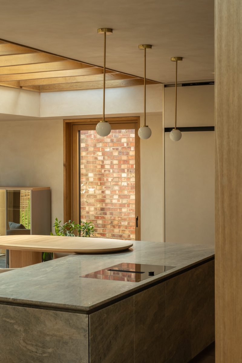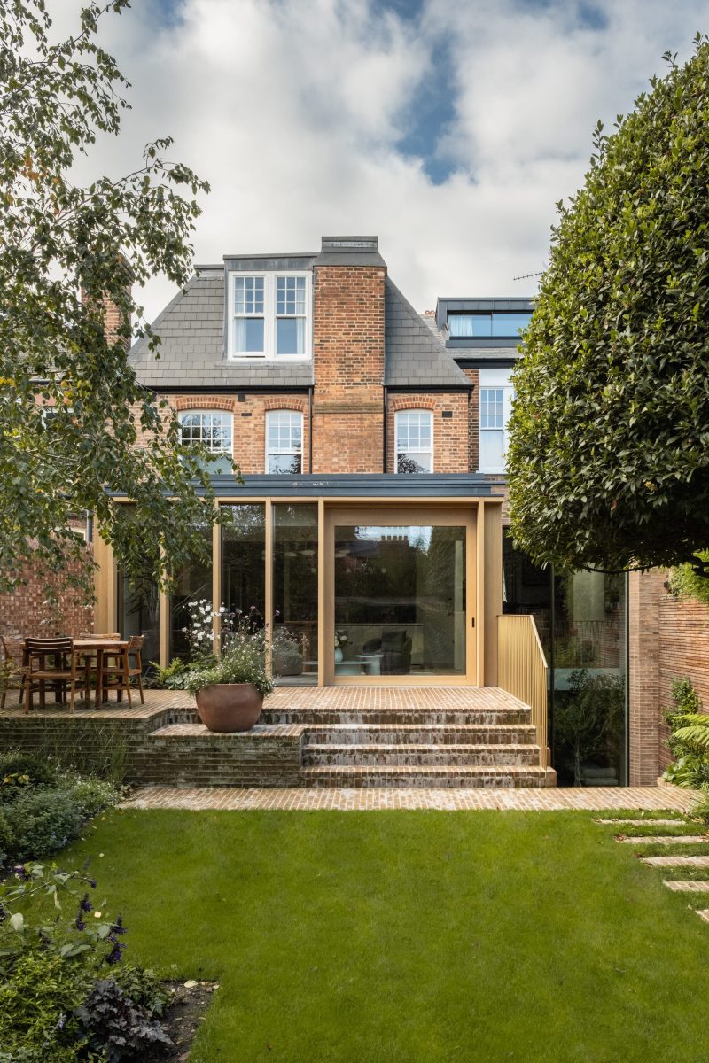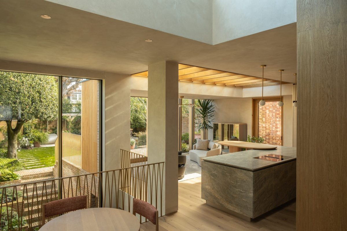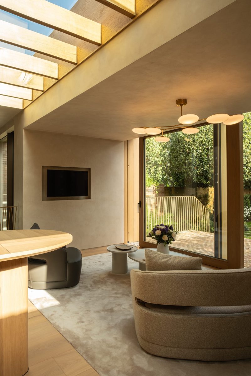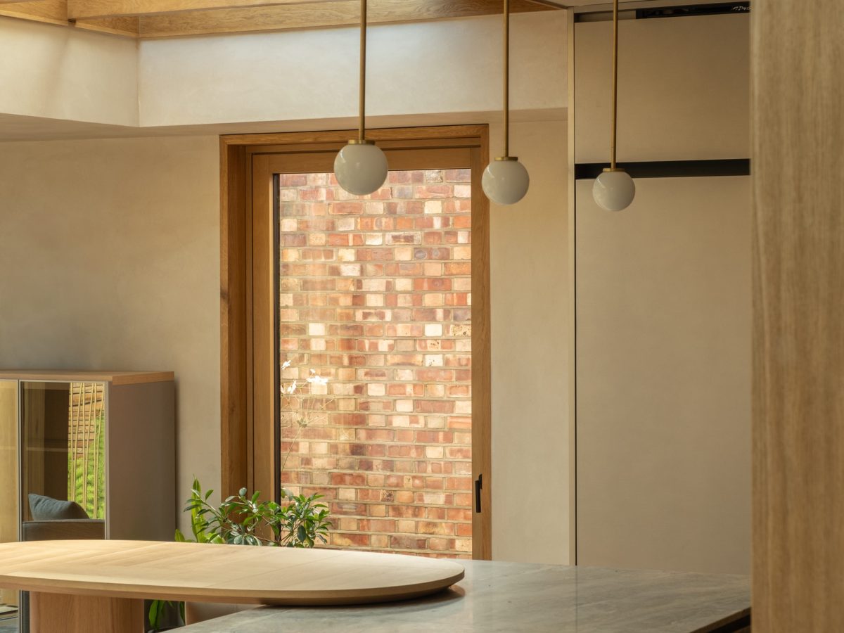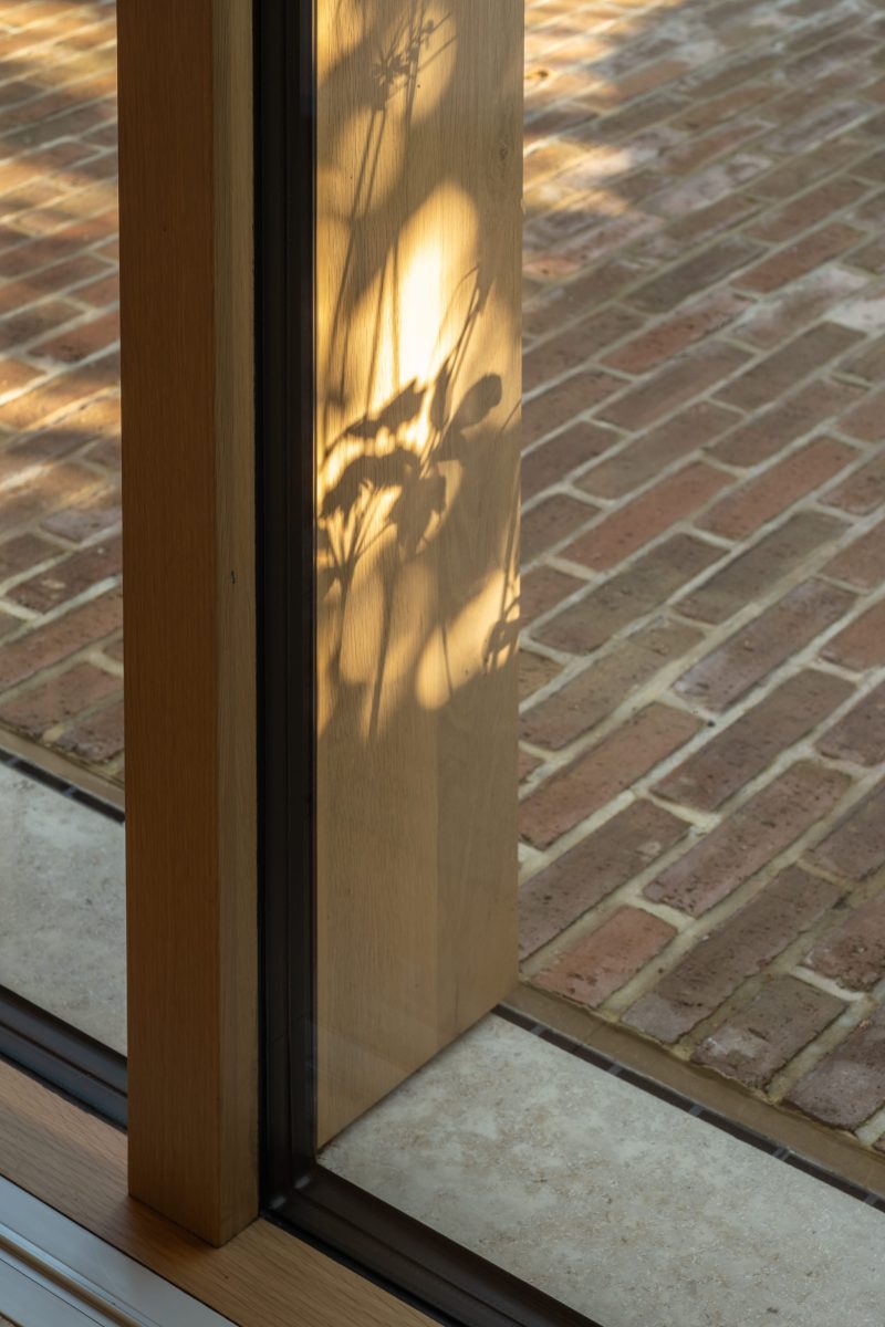 This detail demanded precision engineering and close collaboration between the design and fabrication teams. The result is a fully flush threshold and an expanse of glazing that wraps seamlessly around the extension, connecting to a matching window beyond. The oak fins align perfectly across the façade, maintaining rhythm and harmony throughout the design.
