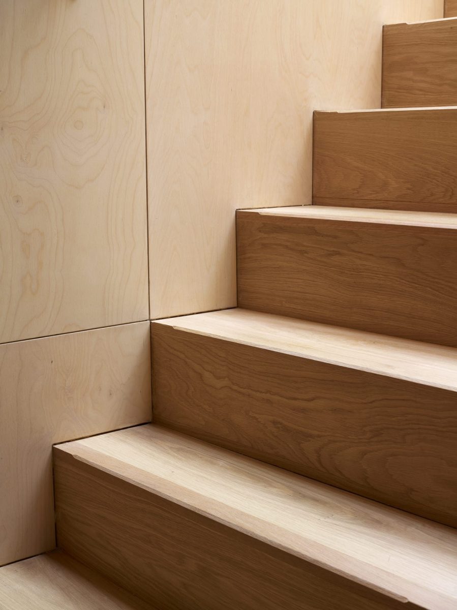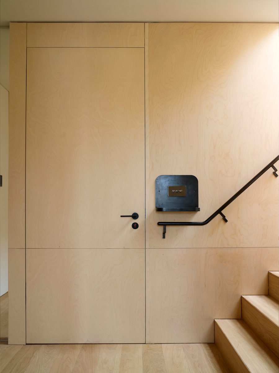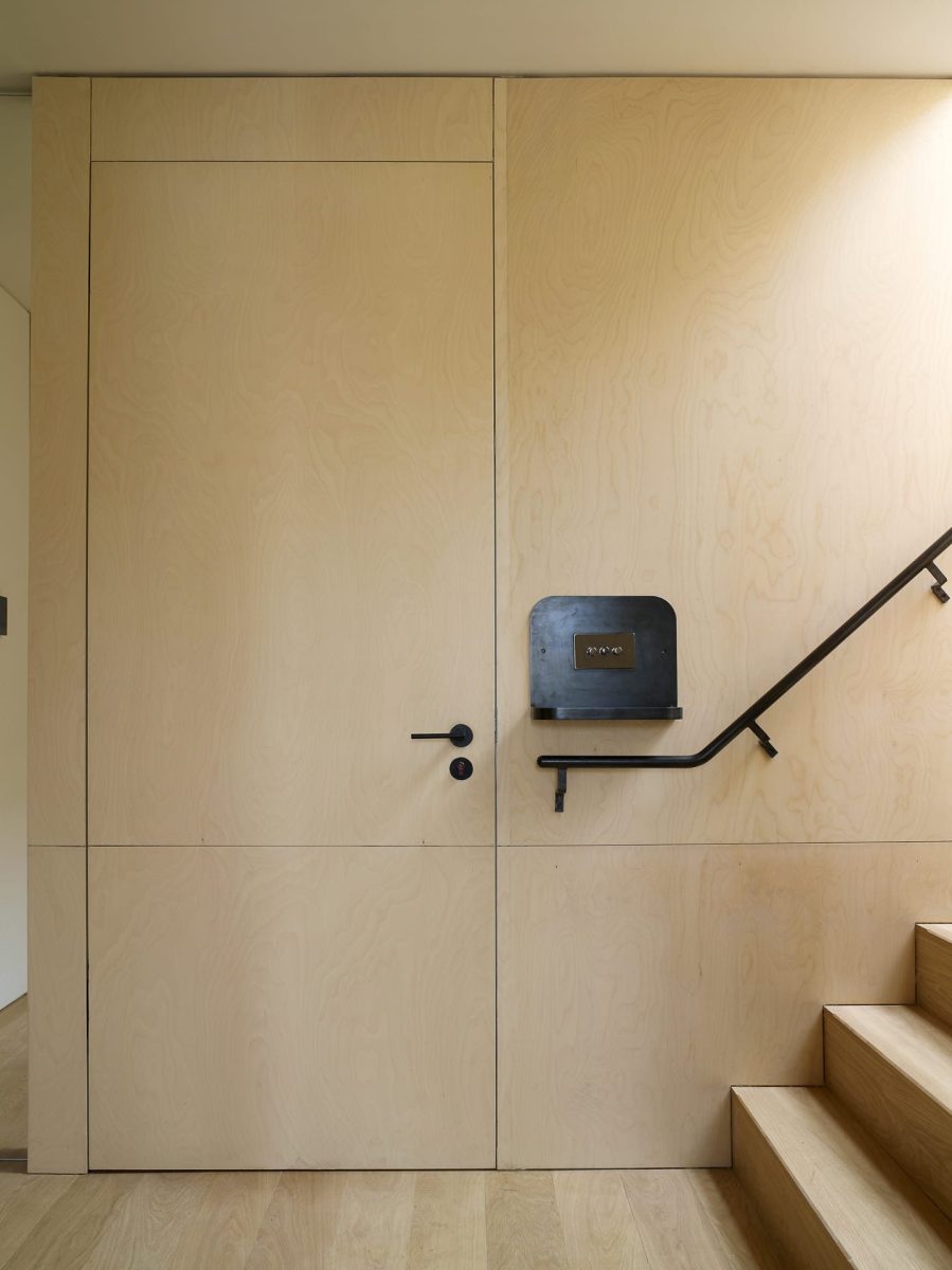 Ecovia worked closely with the architects to deliver a fully integrated joinery and door system that would unify the interiors. A Vantage Flush Entrance Door, clad in matching birch plywood, blends almost invisibly with the wall panelling — its solid construction providing high security without disrupting the visual rhythm of the space.