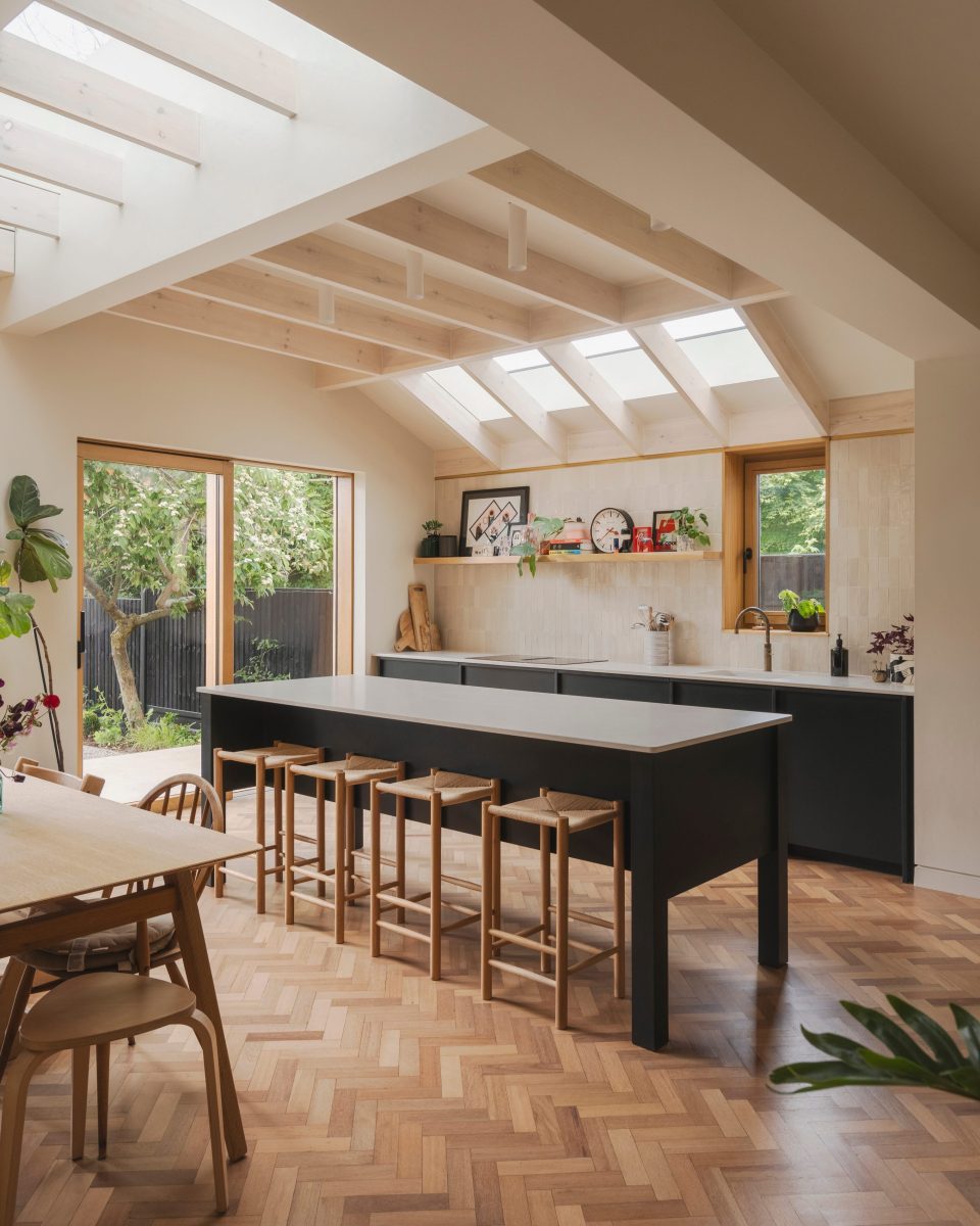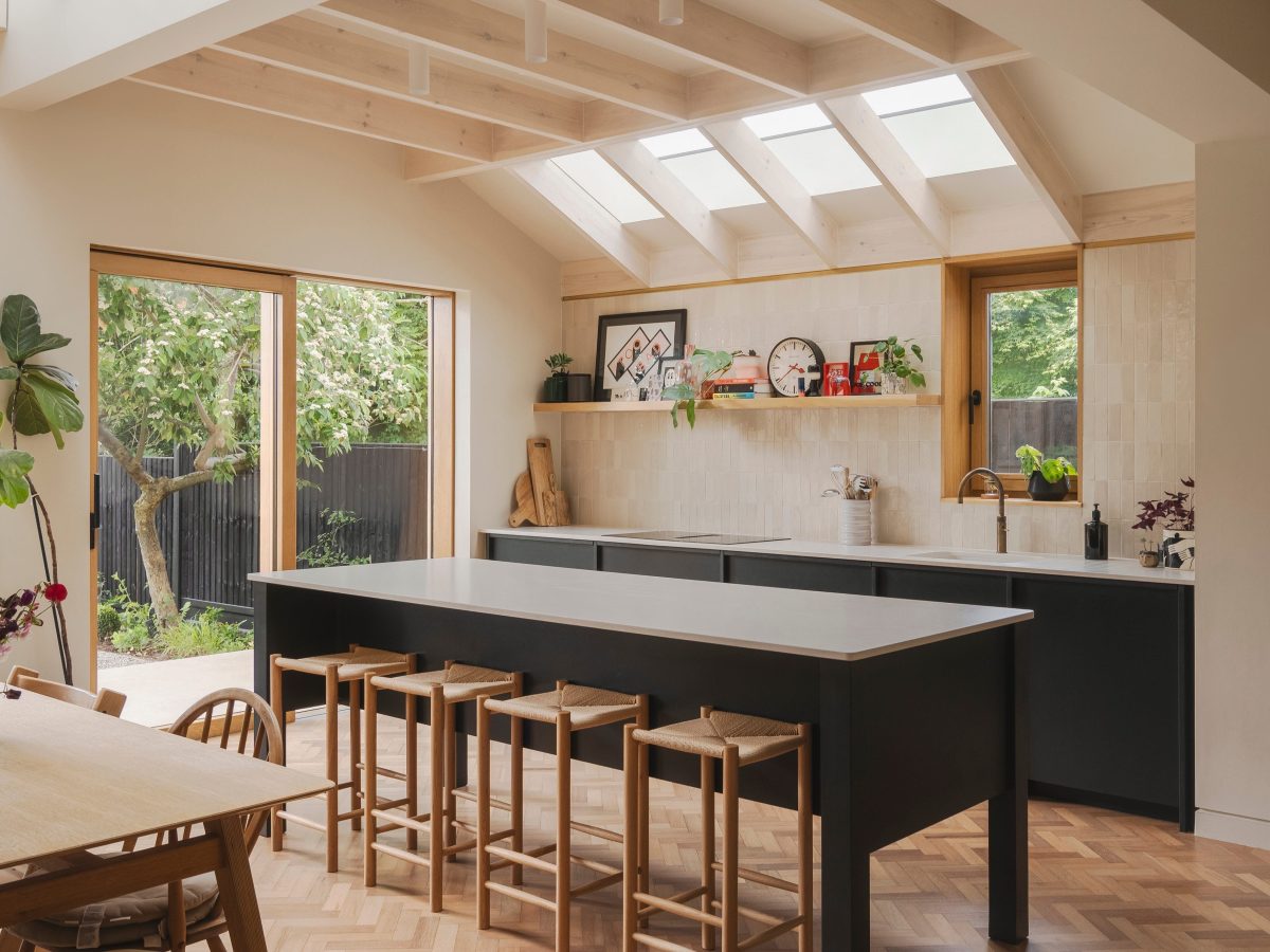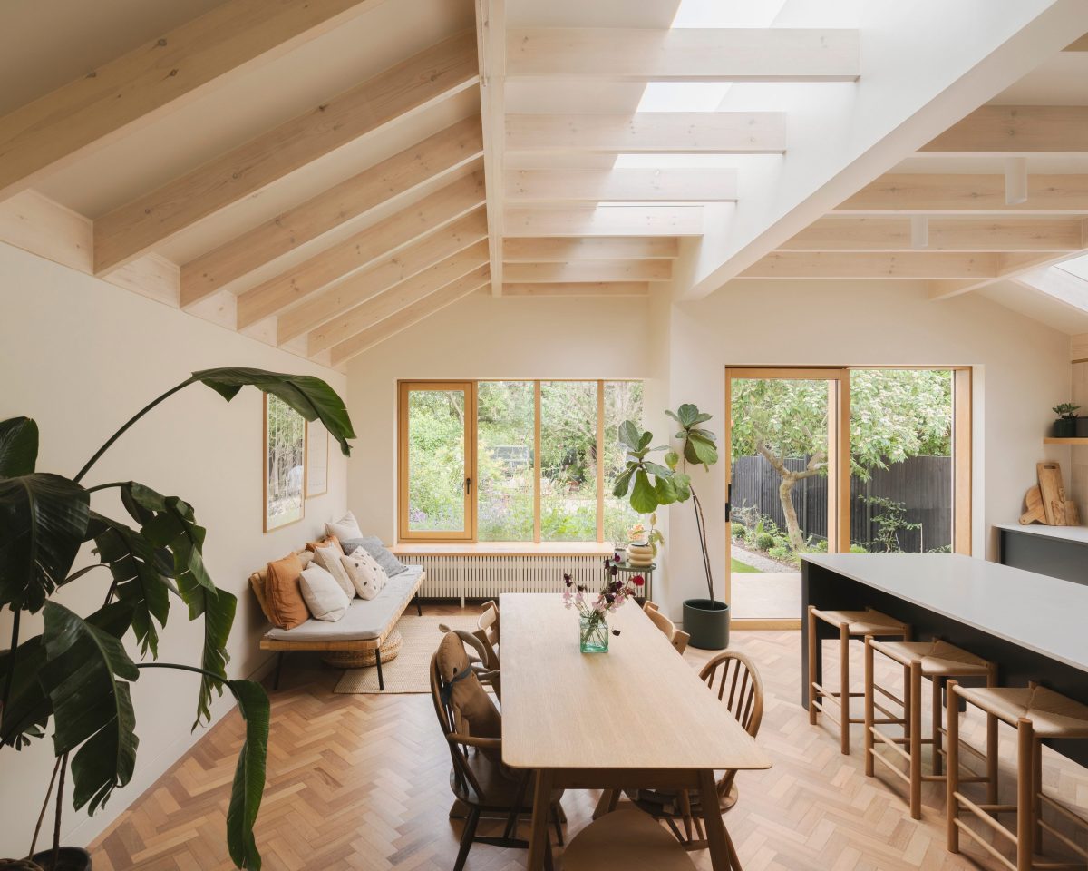 A large frameless sliding door connects the interior to the garden terrace, continuing the same oak tone as the window frames and cladding for a seamless visual transition. Inside, exposed beams and rooflights flood the kitchen and dining space with natural light, enhancing the tactile warmth of the materials.