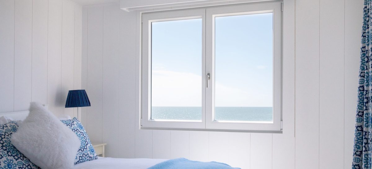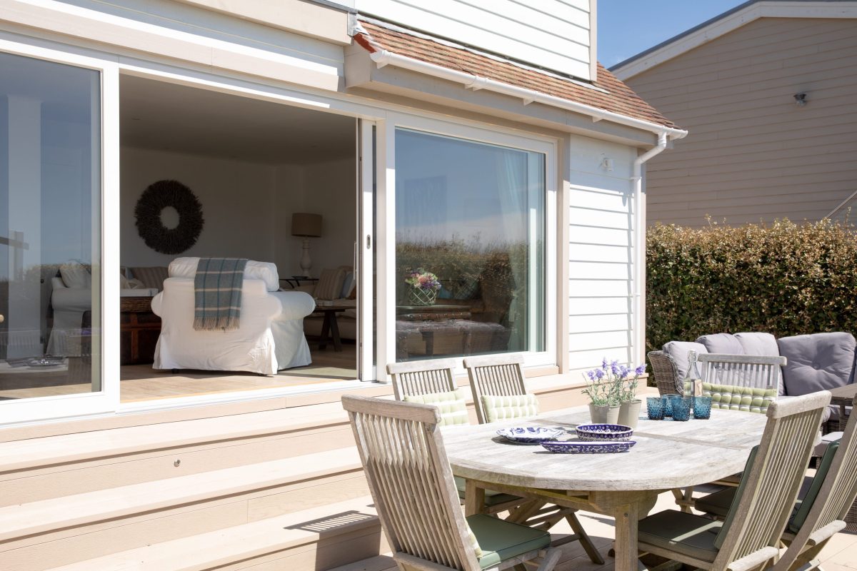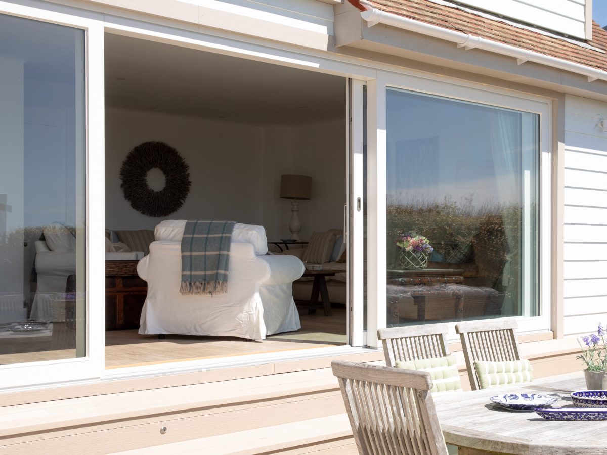 The exterior’s crisp white-painted finish reinforces the home’s bright, coastal aesthetic, while the 6m three-panel Vantage Classic sliding door forms the centrepiece of the living space. Its wide central opening connects directly to the terrace and courtyard, creating an effortless indoor-outdoor flow framed by sea and sky.
